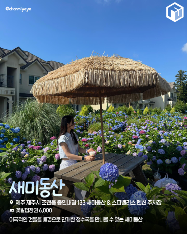 제주 새미동산은 유럽풍 이국적인 건물을 배경으로 펼쳐진 청수국 밭이 인상적인 명소입니다. 스파벨리스 펜션과 함께 운영되어 숙박하며 둘러보기에도 좋습니다. 오전 시간대 방문 시 빛이 부드럽게 들어와 사진이 가장 예쁘게 나옵니다.