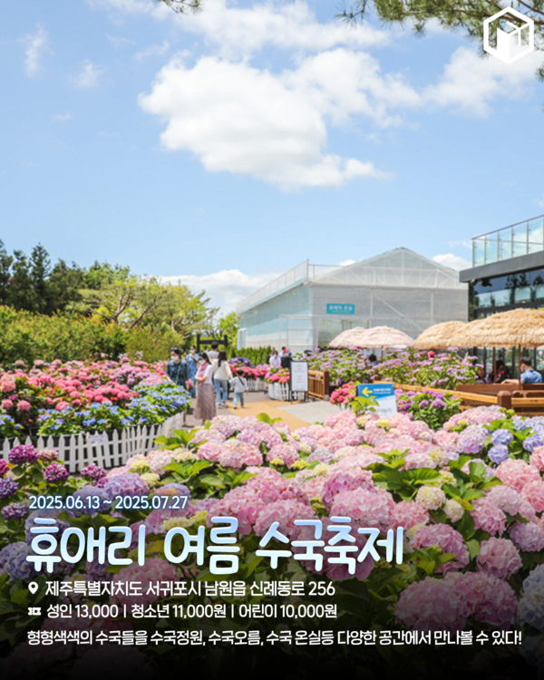 휴애리 자연생활공원 수국축제 -제주특별자치도 서귀포시 남원읍 신례동로 256 - 2025.06.13 ~ 2025.07.27 - 성인 13,000ㅣ청소년 11,000원ㅣ어린이 10,000원