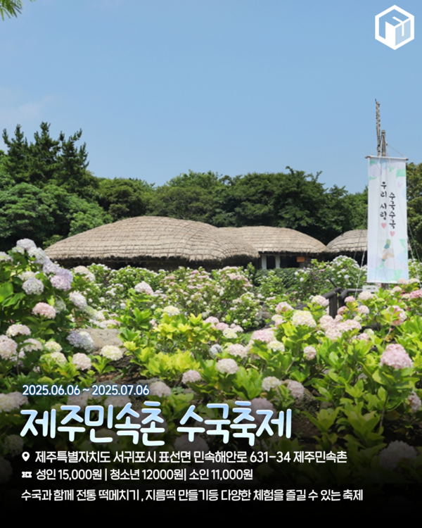 제주민속촌 수국축제 - 제주특별자치도 서귀포시 표선면 민속해안로 631-34 제주민속촌 - 2025.06.06 ~ 2025.07.06 - 성인 15,000원 | 청소년 12000원| 소인 11,000원