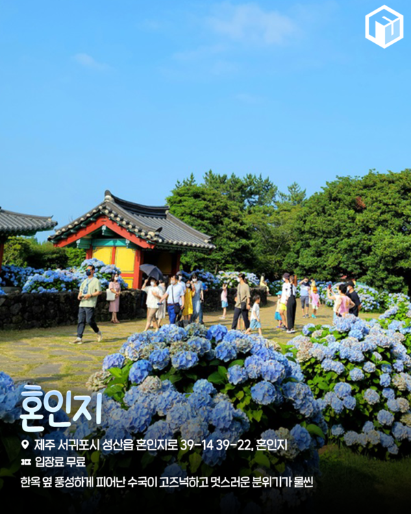 혼인지는 전통 혼례의 전설이 전해지는 한옥 유적지로, 수국이 고즈넉한 한옥과 어우러져 조용한 풍경을 자아내는 제주 대표 수국 명소입니다. 관광객이 비교적 적어 여유로운 감상이 가능하고, 역사적 장소와 자연을 함께 경험할 수 있어 뜻깊은 여행지가 됩니다.