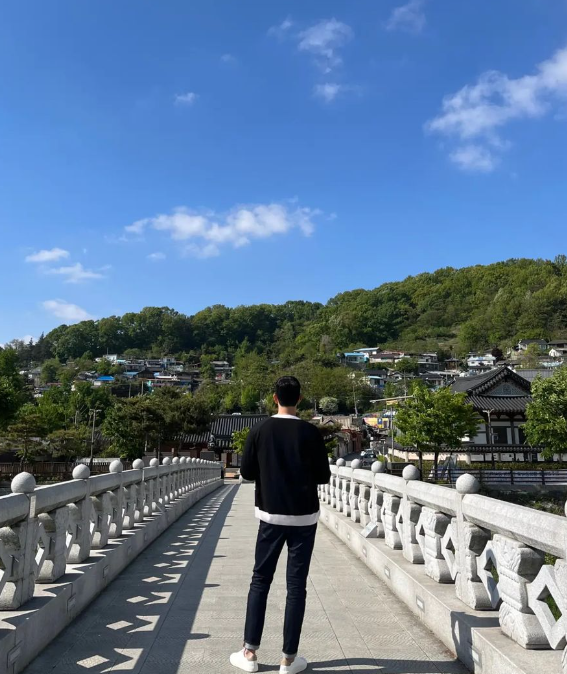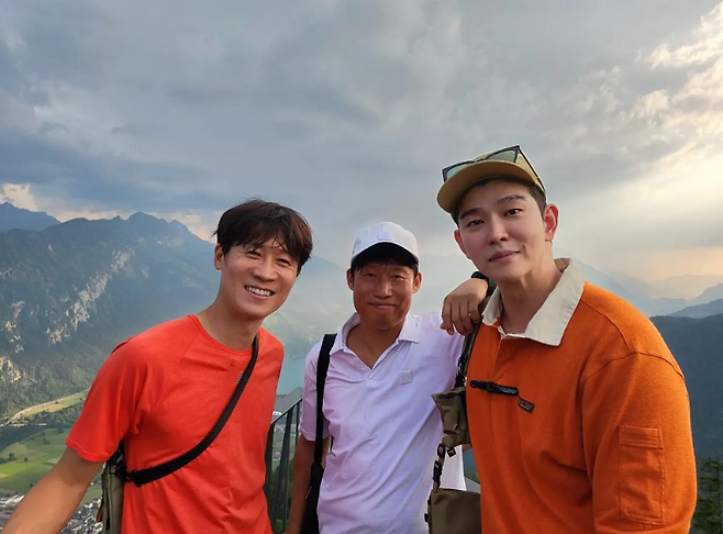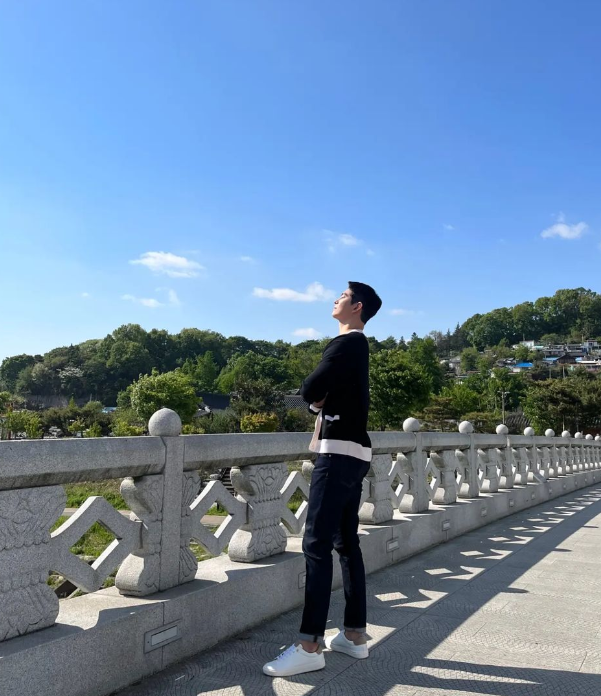 윤균상은 여행룩으로도 색감이 있는 오렌지 컬러 카라 티셔츠로 화사한 분위기를 나타냈습니다.