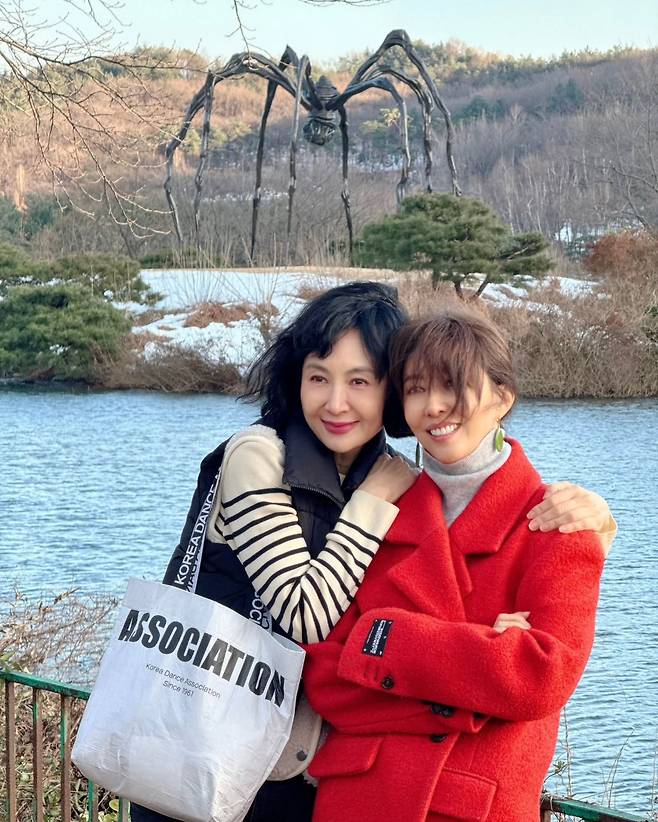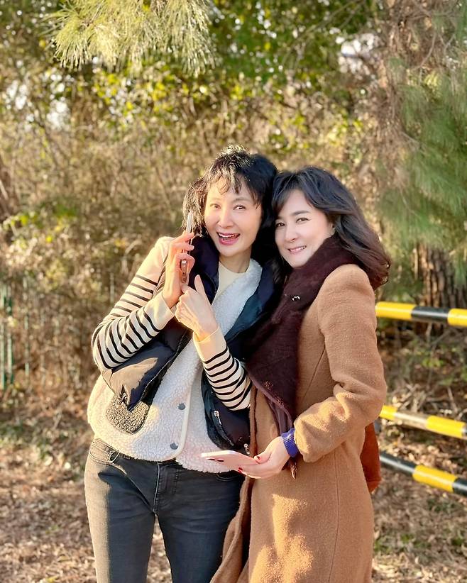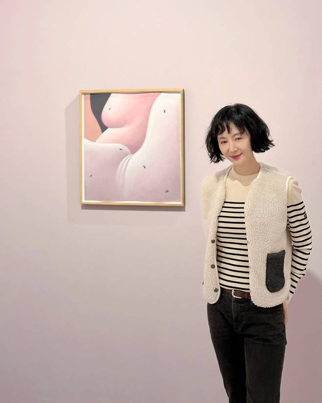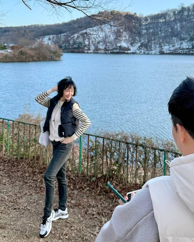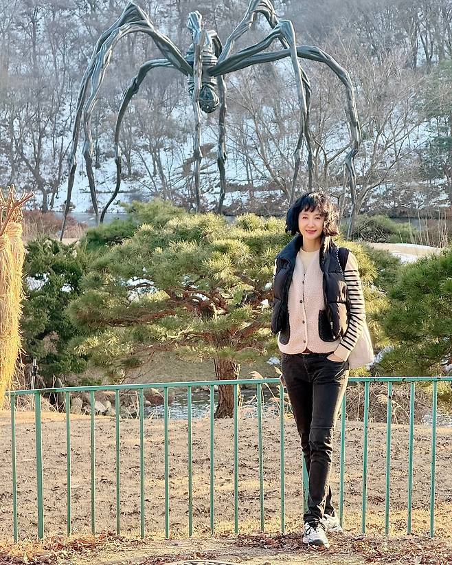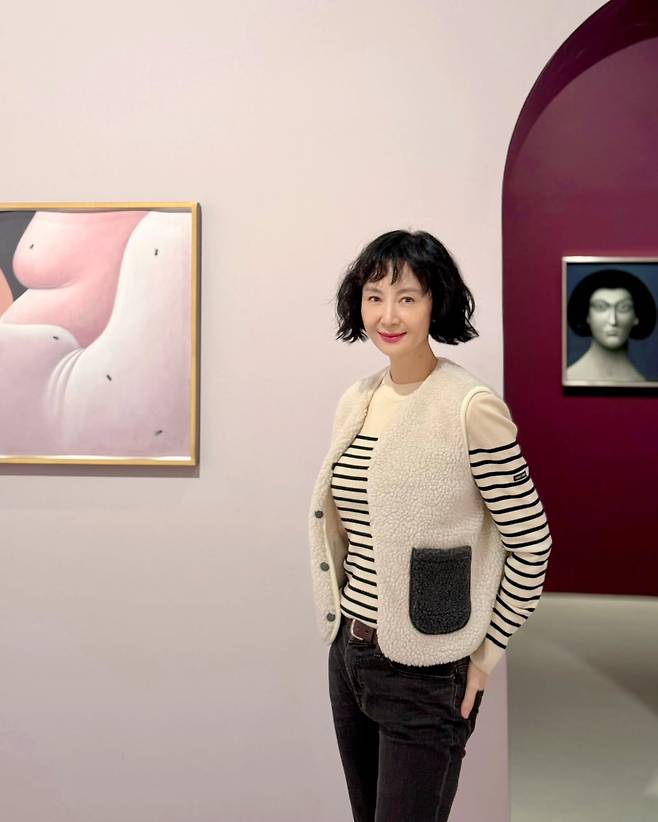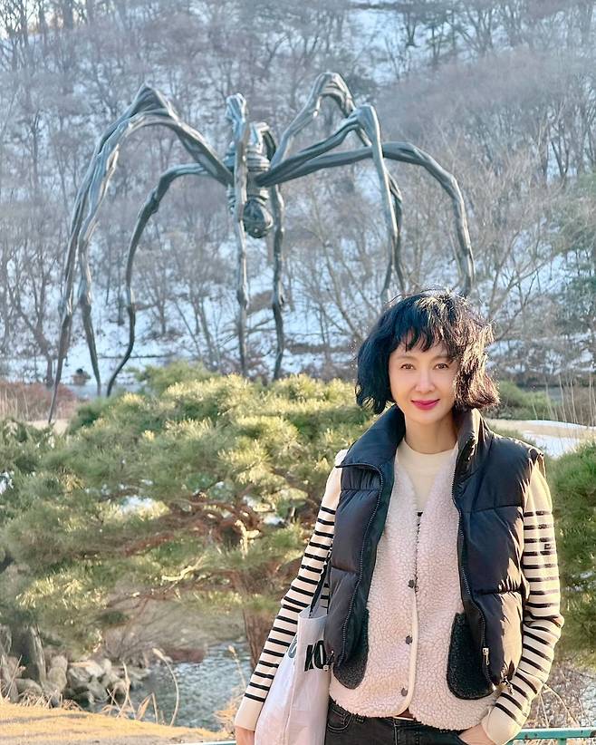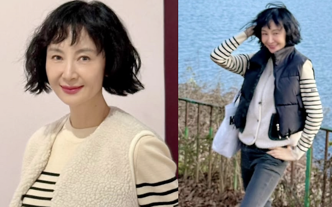 사진 속 채시라는 블랙 스키니진에 스트라이프 니트와 양털조끼를 매치해 포근한 겨울 패션을 선보였습니다.