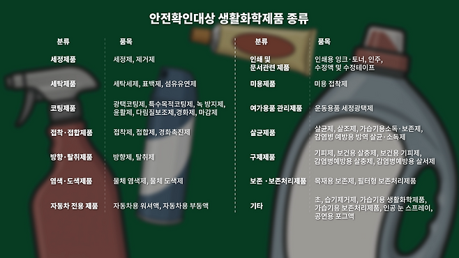 그래서 현재는 우리가 집이나 사무실 같은 일상생활 속에서 자주 쓰는 화학제품 중 사람이나 환경에 해로울 수 있는 제품을 '안전확인대상 생활화학제품'이라 하여, 정해진 안전·표시 기준을 충족해야만 유통·판매가 가능하도록 관리되고 있습니다.