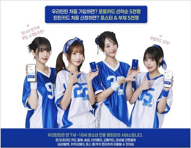 지난 4일 우리은행은 공식홈페이지를 통해 ‘틴틴카드 QWER에디션 출시 기념 이벤트’ 소식을 알렸다. 틴틴카드는 만 7세~18세 청소년을 대상으로 발급되는 선불형 체크카드로 계좌 없이도 발급이 가능하다. 7~13세의 경우 부모의 친권 확인을 거친 후 자녀 명의의 휴대폰으로, 14~18세 청소년의 경우 본인 명의 휴대폰으로 즉시 가입이 가능하다. 틴틴카드의 QWER 에디션 디자인은 총 3종으로 이 중 자신이 마음에 드는 디자인 1개를 골라서 신청할 수 있다. 카드는 걸그룹 QWER 멤버들의 화보 사진으로 디자인됐다.