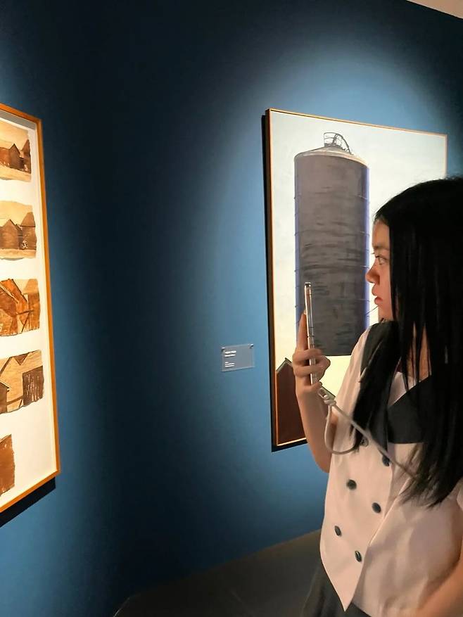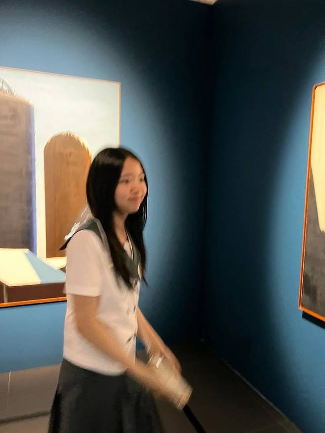 짙은 청색 벽면과 조용한 갤러리 분위기 속, 정시아가 또 한 번 눈길을 사로잡았다. 단정한 세일러 스타일의 교복 셔츠와 네이비 플리츠 스커트를 입은 모습은 마치 영화의 한 장면을 연상케 한다. 약간 흐릿하게 잡힌 순간조차 그녀의 여리한 분위기를 그대로 담아내며, 자연스러운 움직임에서도 패션 감각이 느껴진다.