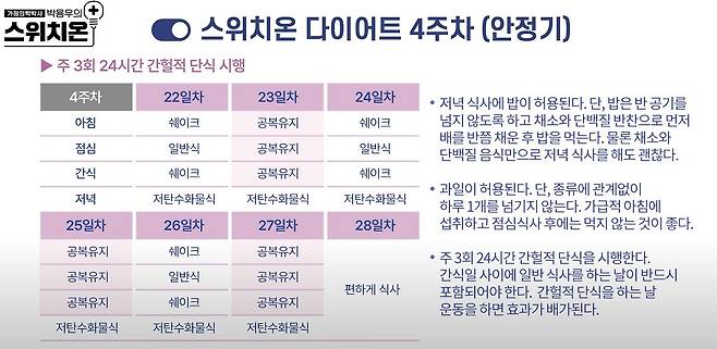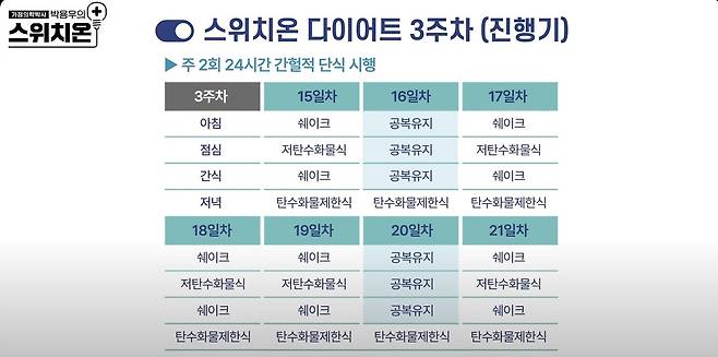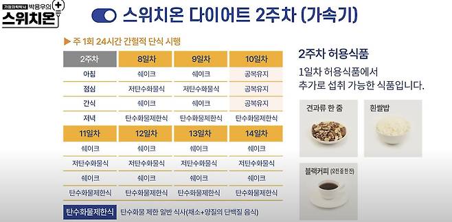 박용우 강북삼성병원 가정의학과 교수는 스위치온 다이어트가 탄수화물 섭취를 극단적으로 줄이고, 단백질 섭취를 늘려서 지방을 더 많이 사용하는 몸으로 체질을 바꾸어 준다고 말한다.