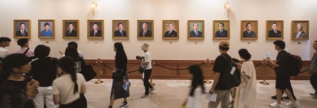 청와대 본관 양쪽에는 별관이 하나씩 있습니다. 앞에서 봐 왼쪽이 세종실이고 오른쪽이 충무실입니다. 국무회의장으로 쓰던 세종실 앞에는 역대 대통령 12명의 초상화가 걸려 있습니다. 그림은 금박 테두리의 가로 53㎝ 세로 65㎝짜리 액자에 들어 있습니다. 재임기간이 다를 뿐 똑같은 무게를 가진 대통령들이니 모양과 규격을 통일했습니다. 앞으로 추가하게 될 대통령들도 이 규칙을 따르게 됩니다. 대통령이 퇴임하기 1년 전 초상화 제작에 들어갑니다. 추천받은 화가가 그린 초안에 대통령의 의견을 반영합니다. 액자는 마지막 국무회의를 마친 뒤 거는데 이 행사를 헌액게첩(獻額揭帖)이라 합니다.