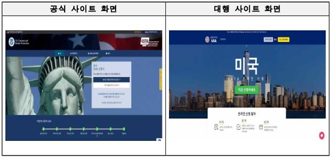 소비자원은 "전자여행허가제도를 운영하는 주요 국가들의 공식 사이트는 캐나다를 제외하고 '정부'를 뜻하는 'gov'를 포함한 인터넷 주소를 사용하고 있다"며 "대행 사이트 웹페이지에 '정부와 제휴를 맺지 있지 않음' 등의 문구가 있다면 공식사이트와 비교가 필요하다"고 조언했다.
