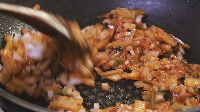 파 향이 솔솔 올라오기 시작할 때, 김치와 설탕을 넣어 주세요. 설탕을 넣어 같이 볶으면 김치의 신맛을 잡아 더욱 맛있답니다.