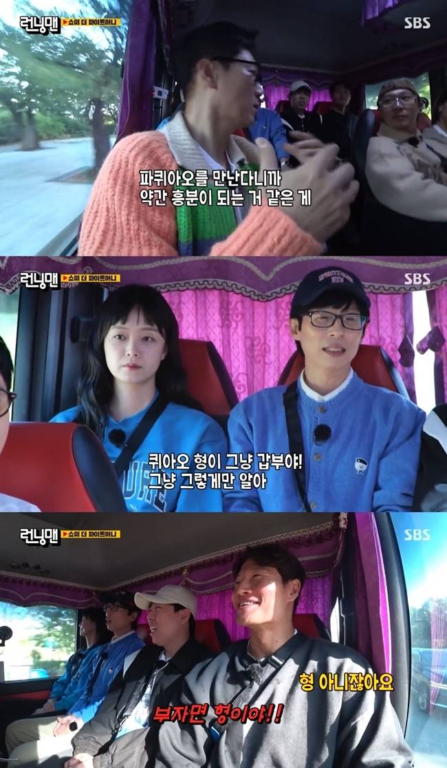 또 지석진은 "파퀴아오를 만난다니까 흥분되는 게 좀 덥다"고 설렘을 드러냈고, 김종국은 "형 갱년기야"라고 돌직구를 날렸다.