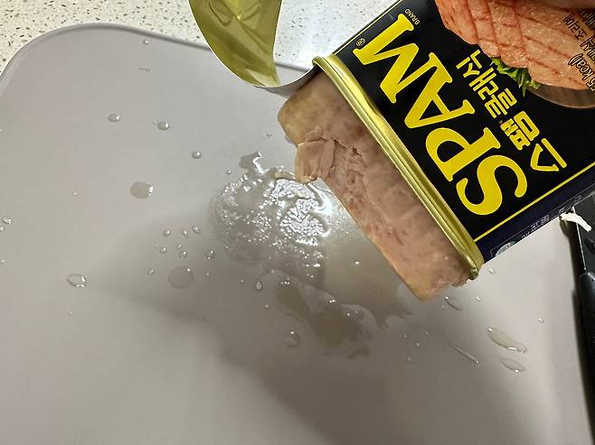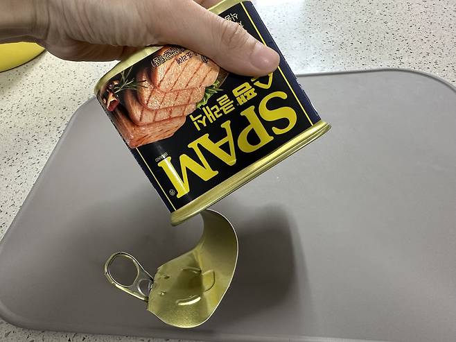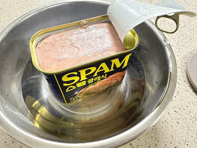 5초만 담가두었을 뿐인데 바닥에 있던 기름이 녹아 캔과 햄이 쉽게 분리가 되더라고요.