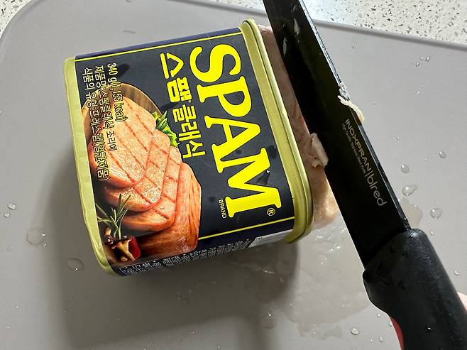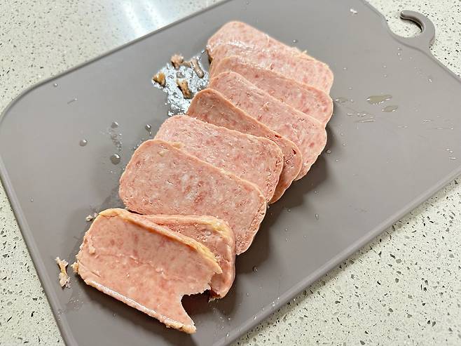 참고로 햄을 자를 때 통조림 캔에 넣어서 잘라주시면 손에 기름이 묻지 않아 자르기가 쉬우니 참고해 주세요.