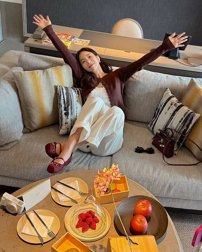 테이블 위에 놓인 딸기와 사과, 그리고 깔끔하게 세팅된 식기가 함께 포착되면서, 기은세가 즐긴 여유로운 여행의 한 순간이 더욱 생생하게 전해졌다. 작은 버건디 컬러 백과 블랙 선글라스도 소파에 자연스럽게 놓여 있어, 전체 룩에 맞춘 스타일링이 얼마나 세심했는지를 느끼게 했다. 특히 미니백은 플랫 슈즈와 같은 톤의 컬러로 맞춰 스타일링의 완성도를 높였다.