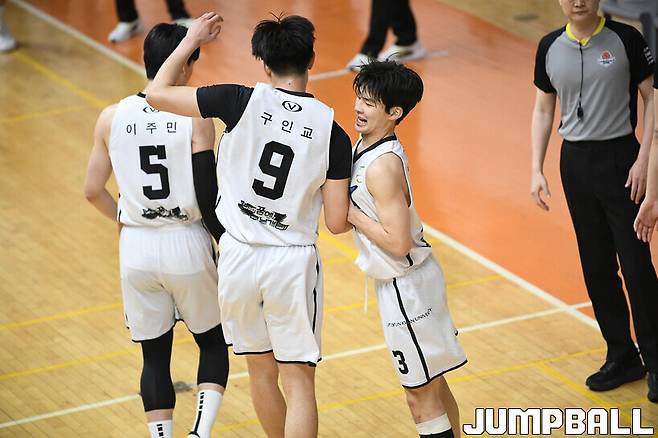 [점프볼=필동/유용우 기자] 28일 동국대 서울캠퍼스 체육관에서 열린 2025 KUSF 대학농구 U-리그 동국대와 성균관대의 경기, 성균관대 구인교와 강성욱이 공격 성공에 환호하고 있다.