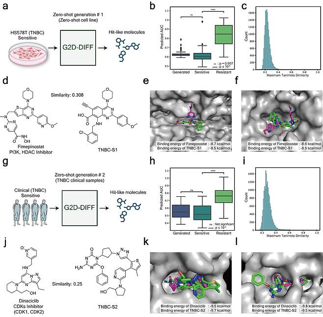 연구팀은 G2D-Diff 모델을 난치성 암의 대표 사례인 삼중-음성 유방암에 적용해 실제 활용 가능성을 검증했다. 환자들의 유전자 변이 정보를 입력해 생성한 후보물질들은 암세포 증식을 억제하는 핵심 단백질인 PI3K, HDAC, CDK 등을 정확히 표적으로 삼았다.