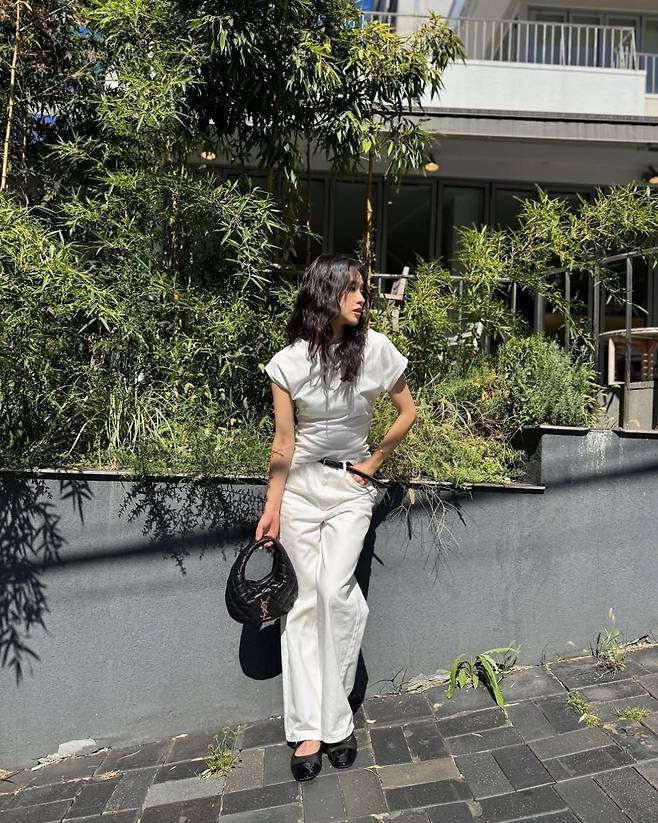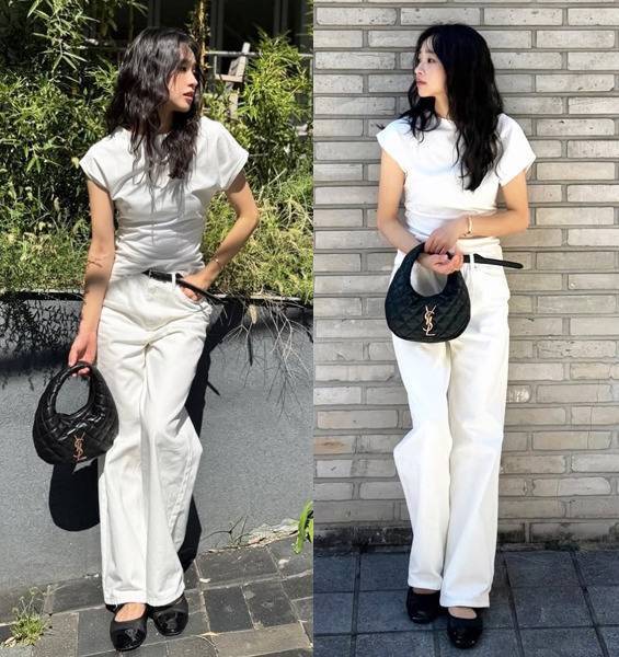 블랙 벨트·토트백·플랫 슈즈로 대비를 주며 시크한 포인트를 더했습니다.