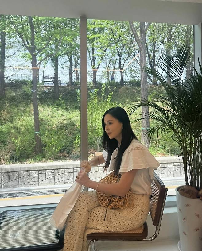 고소영은 화이트 프릴 블라우스에 크림 컬러의 니트 팬츠를 매치해 조용하지만 눈을 뗄 수 없는 고급스러움을 연출했습니다.