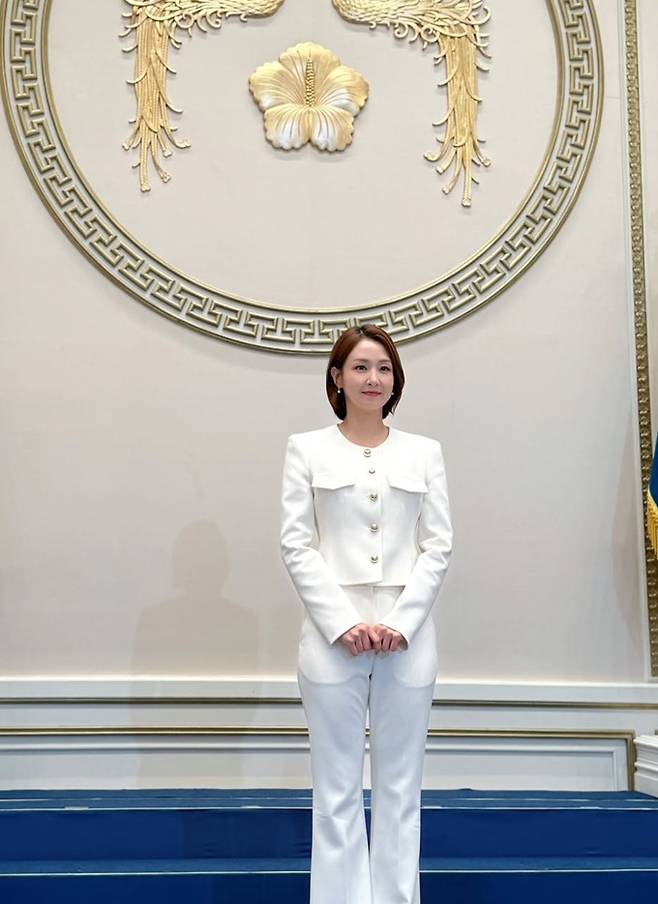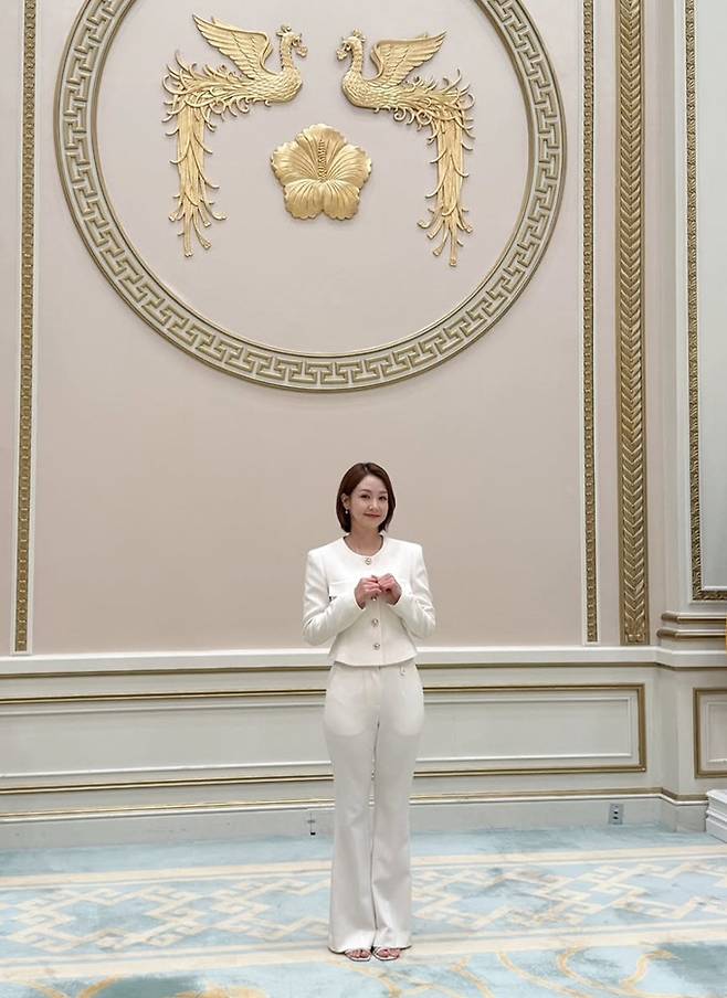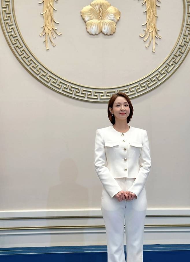 아나운서 겸 배우 오정연이 모던 클래식의 포멀한 올 화이트 MC룩으로 우아한 품격을 드러냈다.