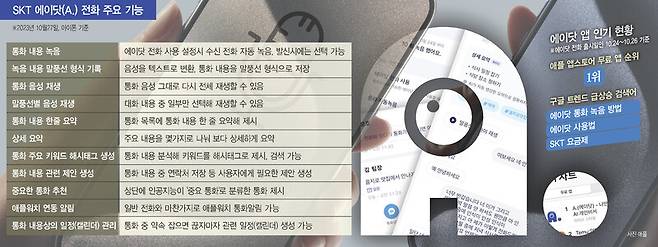 앞서 에스케이텔레콤은 지난 24일 인공지능 앱 ‘에이닷’에 전화 기능을 추가했다. ‘아이폰도 통화 녹음된다’는 정보에 에이닷 전화 앱은 출시 당일부터 애플 앱스토어 무료 앱 분야 내려받기(다운로드) 1위에 올랐다.