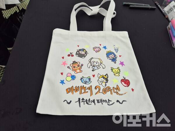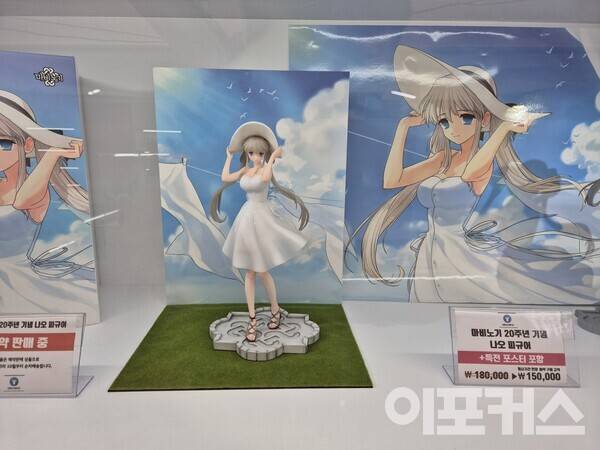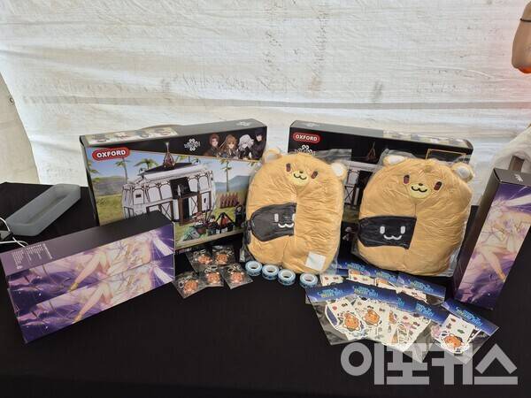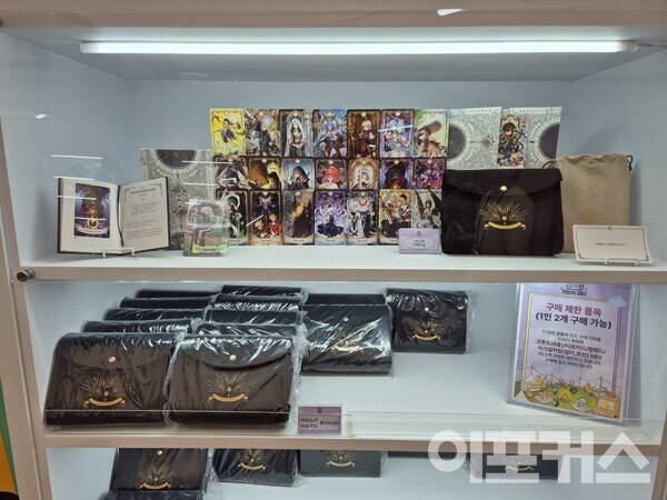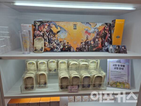 공연장 옆쪽에는 판타지 파티의 핵심이라고 할 수 있는 ‘팝업스토어’가 있었다. 20주년 기념으로 공개한 테마 가이드를 기반으로 제작된 공식 굿즈를 판매하는 곳이었는데, 장패드, 파우치, 키링, 타로카드 등 소유욕을 불러일으키는 굿즈가 많았다. 화룡점정은 ‘마비노기 20주년 기념 나오 피규어’였는데, 주인공 나오가 산뜻한 원피스를 입고 있는 피규어는 18만원이라는 가격에도 많은 관심을 받았다. 행사 기간 현장 예약 구매 시 3만원 할인에 특전 포스터까지 지급했다.