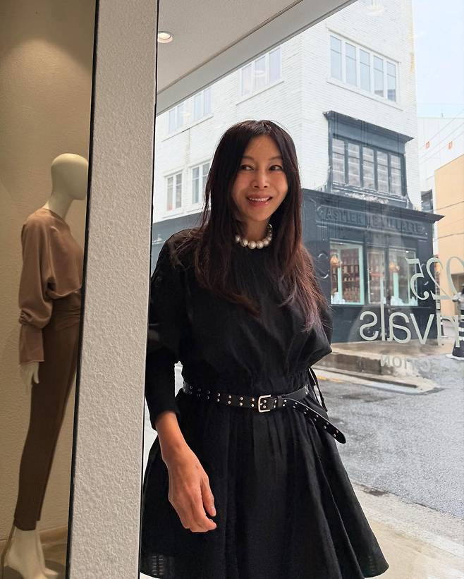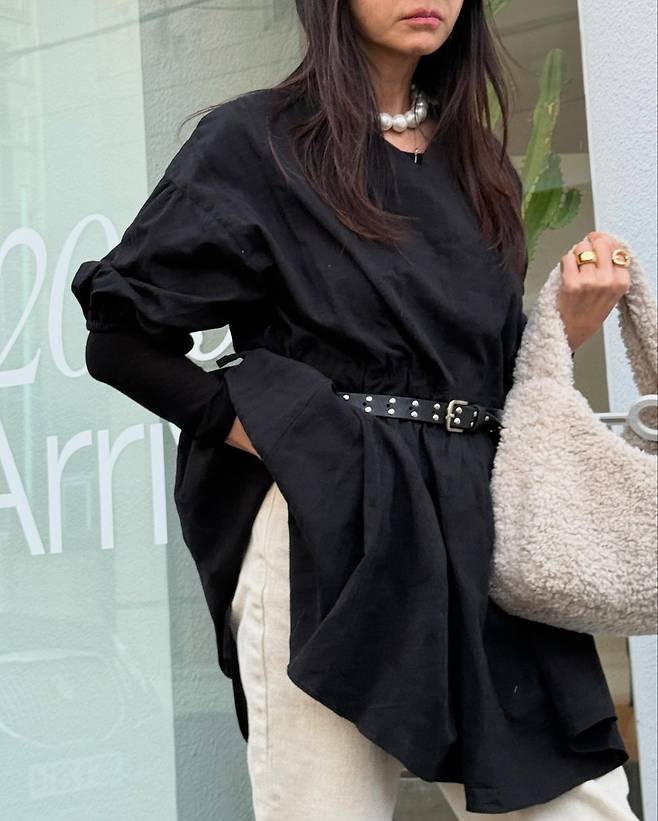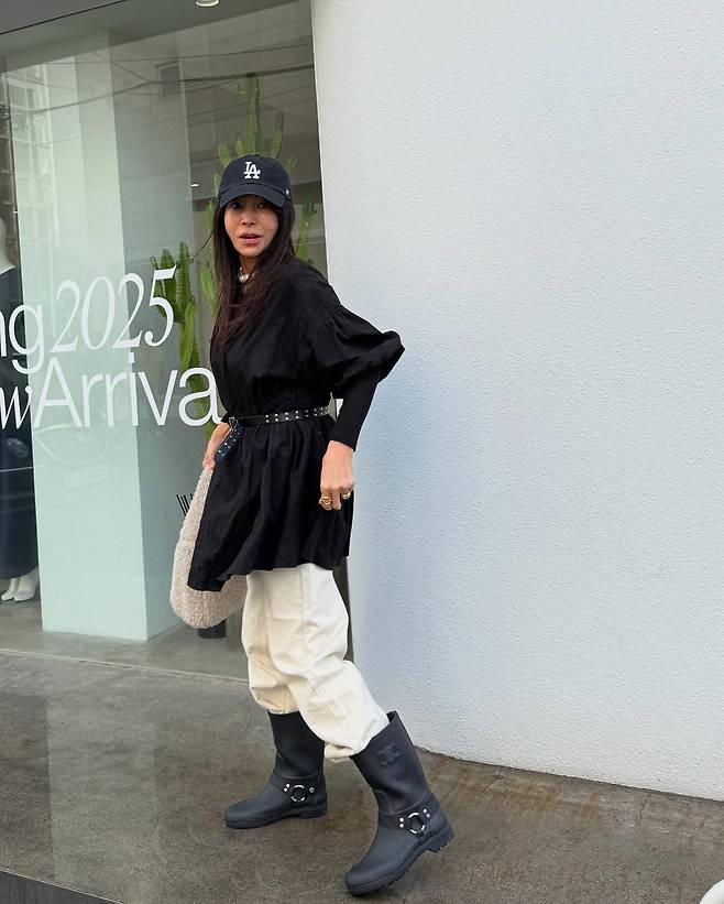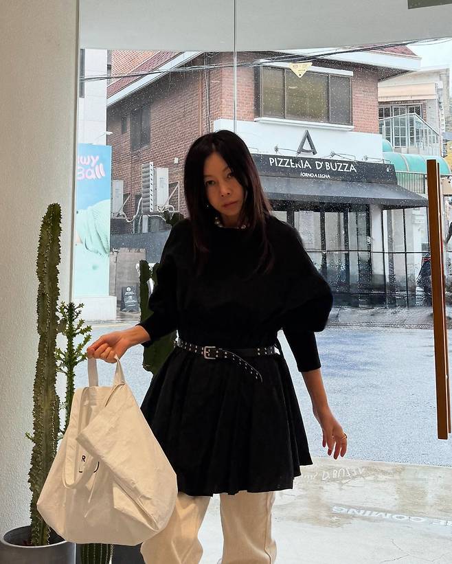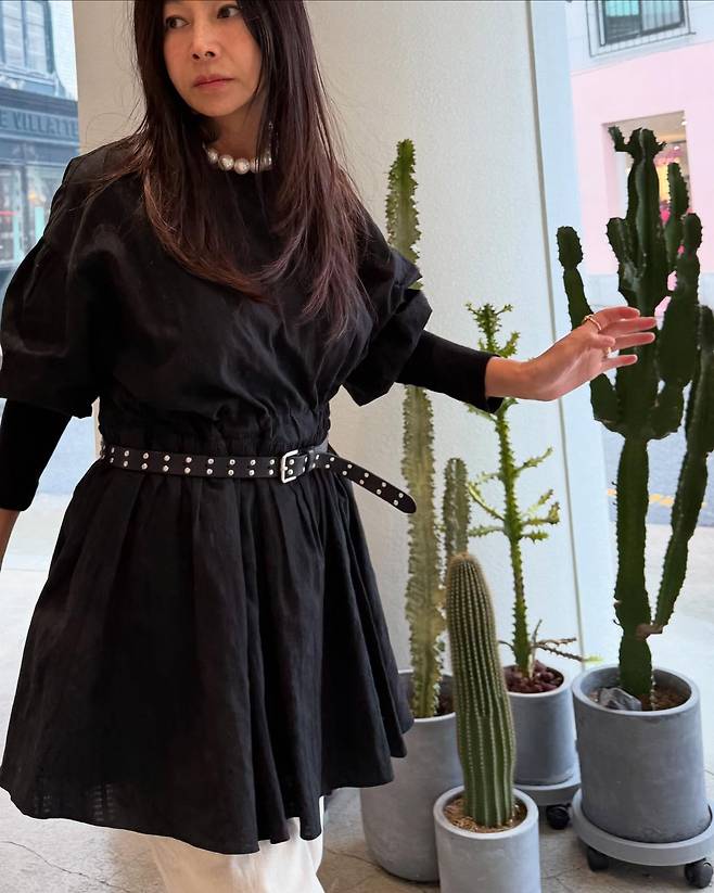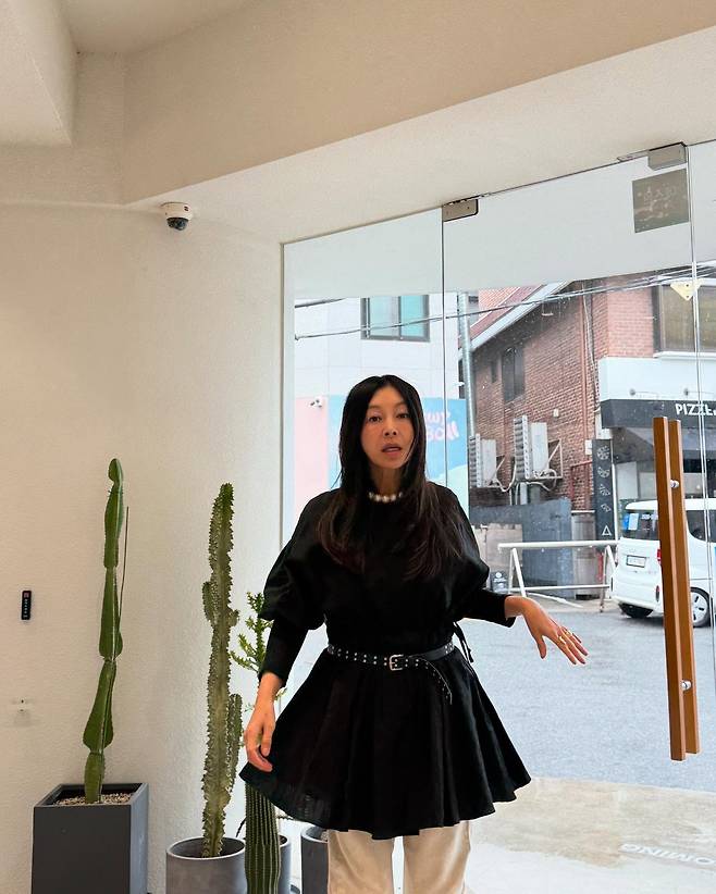 사진 속 황신혜는 블랙 원피스에 화이트 팬츠를 매치하고 벨트로 포인트를 줘 스타일리시한 패션을 선보였습니다.