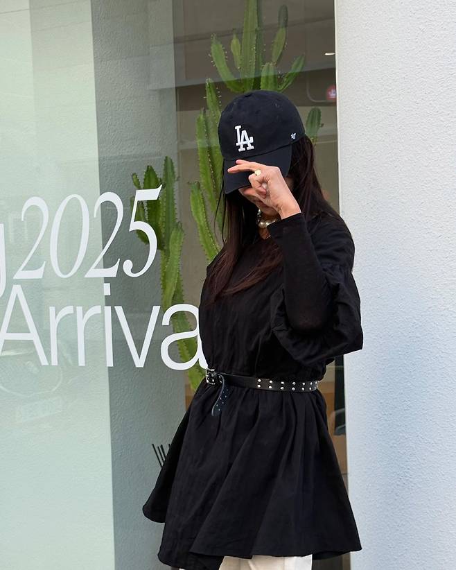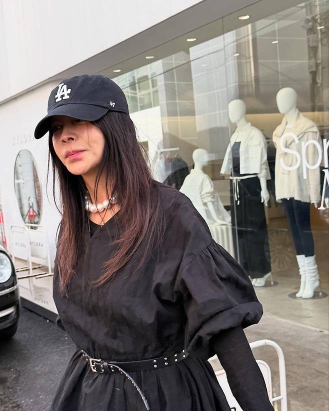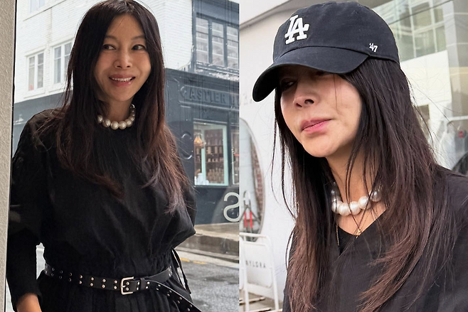 또한 볼캡과 진주 목걸이를 매치해 힙하면서 고급진 패션을 선보인 황신혜입니다.
