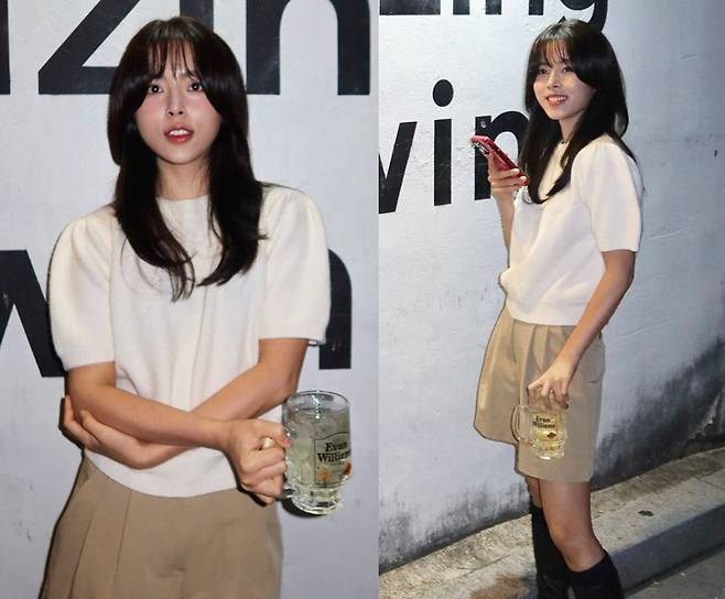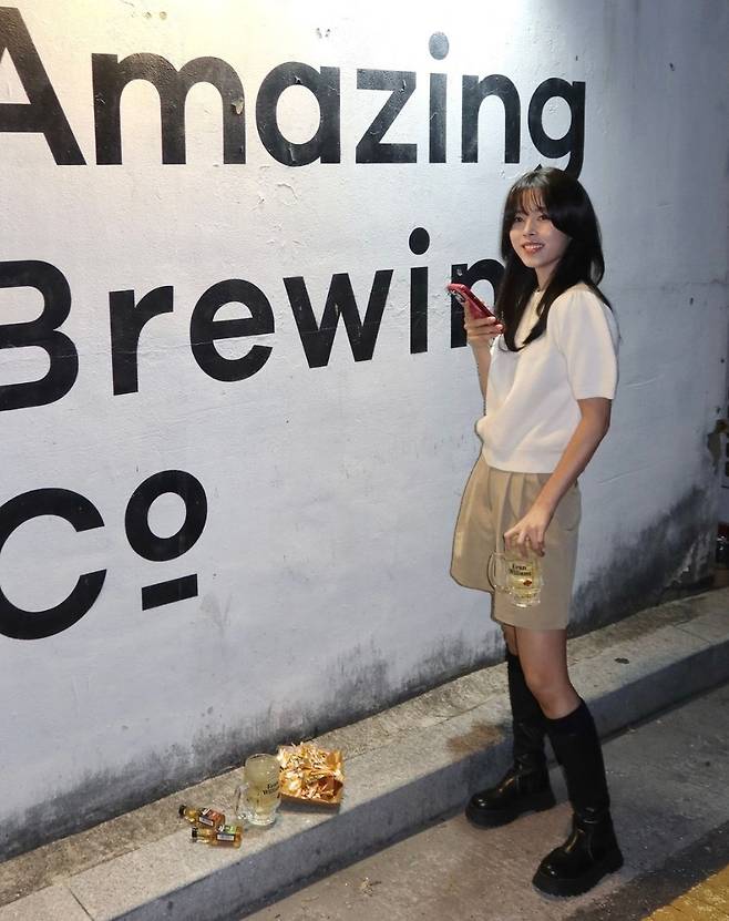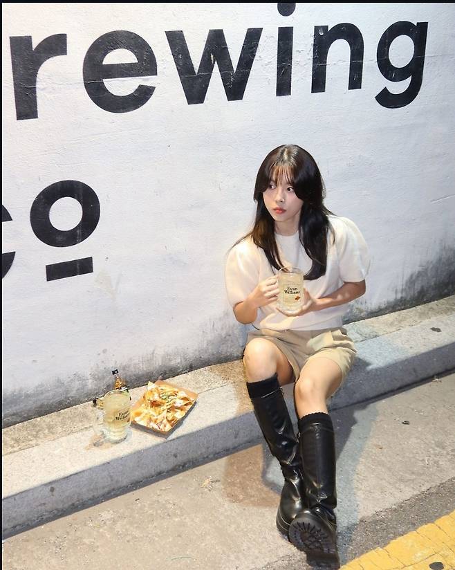 민도희는 흰색 니트 탑에 베이지 쇼츠를 매치해 심플하면서도 세련된 스타일을 선보였으며, 여기에 롱부츠로 포인트를 주어 트렌디하고 일상적인 매력을 뽐냈습니다.