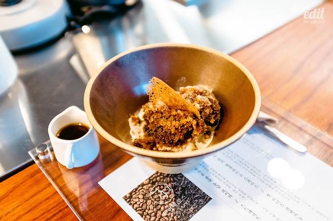 세 번째 메뉴는 보이차 크림 셔벗에 엘파라이소 스파이스 커피를 콜드브루로 혼합했다. 개성있는 커피와 차가 서로를 간섭하지 않고, 포근하게 안아주는 느낌이 좋았다.