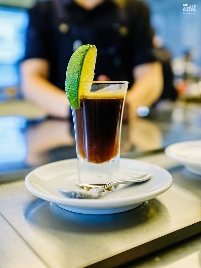 마지막 메뉴는 탠저린 블랙. 콜드 에스프레소에 생크림과 건조 탠저린 과일을 함께했다. 과육을 건지지 말고 시트러스 향을 즐기면서 마셔보자. 과일, 크림,커피의 조합이 순차적으로 나타난다.