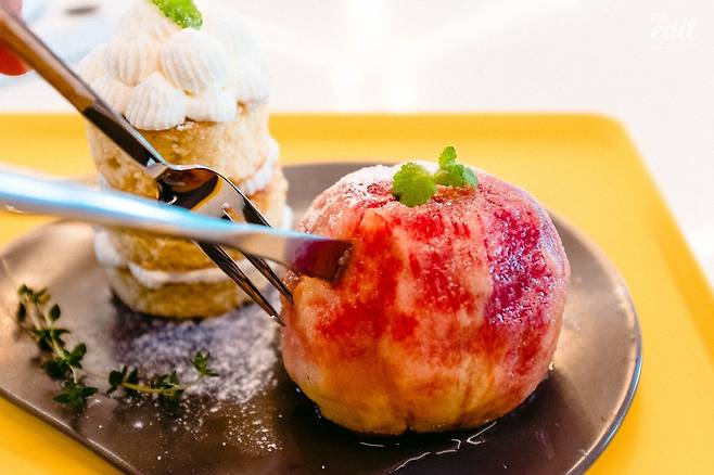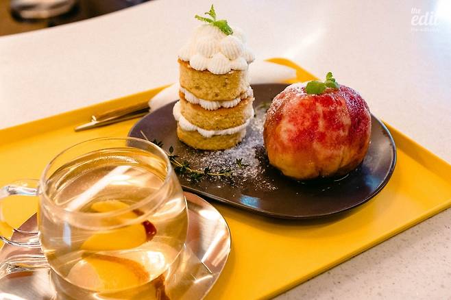 세 번째 메뉴는 씨를 제거하고 껍질을 완전히 제거한 백도에 요거트, 그래놀라 클로버 허니를 가득 채운 후, 피치 에션셜 오일을 첨가한 생크림 스폰지 케익을 허브 버베나 레몬그래스 차와 함께 구성했다. 디저트와 음료가 혼합 과정에서 서로의 장점을 더욱 부각시킨다.