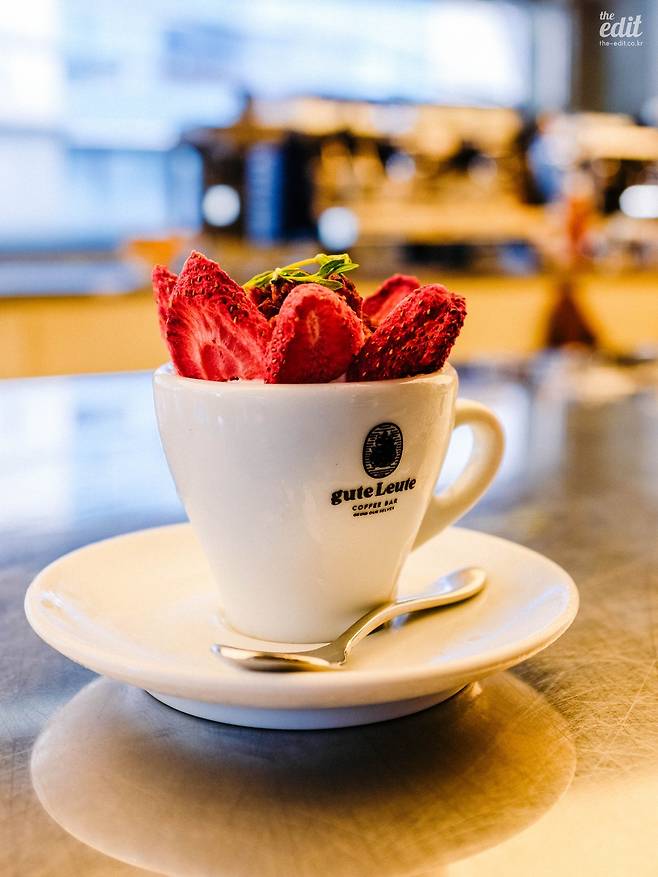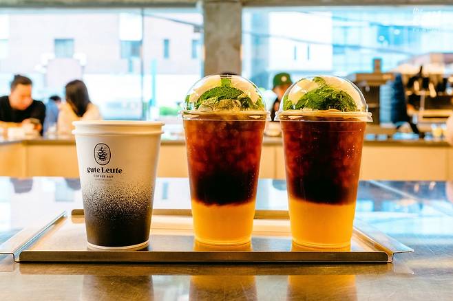 마지막으로(가능하다면?), 서비스로 제공하는 망고주스와 신선한 민트로 청량감과 단맛이 조화로운 테이크아웃 커피를 한잔 더 마셔보자. 활기차고, 친절한 구테로이테 바리스타의 환대가 코스 내내 즐겁게 느껴졌다. 에스프레소 전문점으로서의 좋은 커피맛과 섬세한 코스 구성, 서비스까지 모두 훌륭하다.