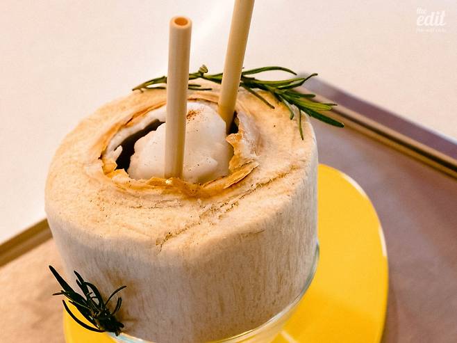 두 번째 메뉴는 코코넛 열매를 즉석에서 가공, 과즙과 연유를 이용한 슬러시 에스프레소 커피 빙수이다. 코코넛 식물성 재료를 사용했지만, 시원한 아이스 라떼와 같은 질감이다.