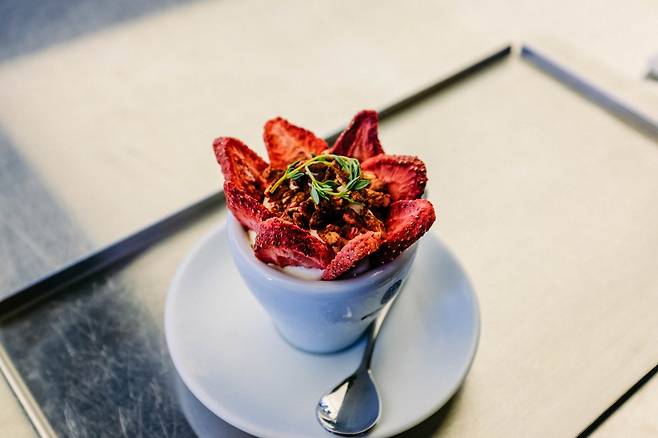 세 번째 메뉴는 베리뱅 콘파나. 콜드 에스프레소를 기준으로 수제 제작 크림, 그래놀라, 건조 딸기를 조합해 떠먹는 디저트로 형상화했다. 비주얼에 밀리지 않는 맛의 임팩트가 강렬하다.