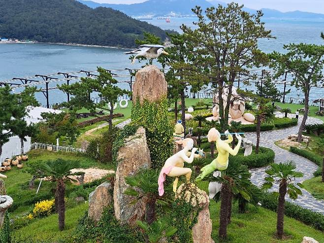 실외 조각공원에는 다양한 현대 조각 작품이 산책로를 따라 배치되어 있습니다. 여수 바다 풍경과 조각 작품이 어우러져 걷는 것만으로도 전시를 관람하는 느낌을 받을 수 있습니다.