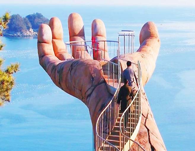 전남 여수 돌산도 끝자락 바다 위에는 거대한 손 모양 조형물이 서 있는 독특한 명소가 있습니다. 푸른 남해 바다 위에 솟아 있는 이 조형물은 여수 여행에서 꼭 들르는 장소로 알려져 있습니다.