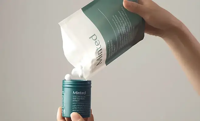 민티드 고체치약_ 고체치약은 치약 성분을 알약 하나 크기로 응축한 고체 형태의 치약으로 두 가지 방법으로 활용된다. 치아로 잘게 씹어 칫솔질하면 일반 튜브형 치약처럼 양치하는 용도로 쓰이고, 외출 시 에는 치약을 씹고 물로 가글하여 구강세정제로도 사용할 수 있다. 고체 형태라 튜브형 치약처럼 어설픈 용량이 남지 않아 전량 사용할 수 있고, 스테인리스 패키지라 재활용률도 높다. 게다가 민티드 치약은 리필제품을 팔아서 패키지를 버리지 않고 계속 보충해 사용할 수 있으며 리필제품의 파우치 또한 생분해성이다. 가격은 1만 1,900원(90정).