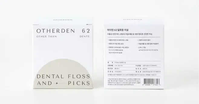 아더덴 62_ 아더덴 치실의 본체는 독성이 없는 열가소성의 목재로 만들어졌고, 사탕수수의 최종산물인 BIO-PE소재로 실을 만들어 CO2 발생량이 적은 탄소중립 소재를 사용한다. 본체와 실 모두 잘 썩는 재질이라 친환경 소재라 할 수 있다. 1만 2,400원(62개입 2세트).