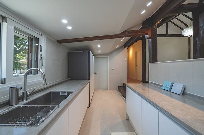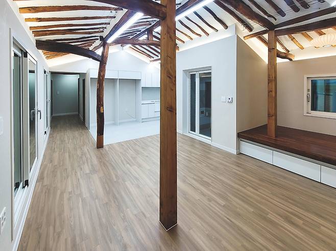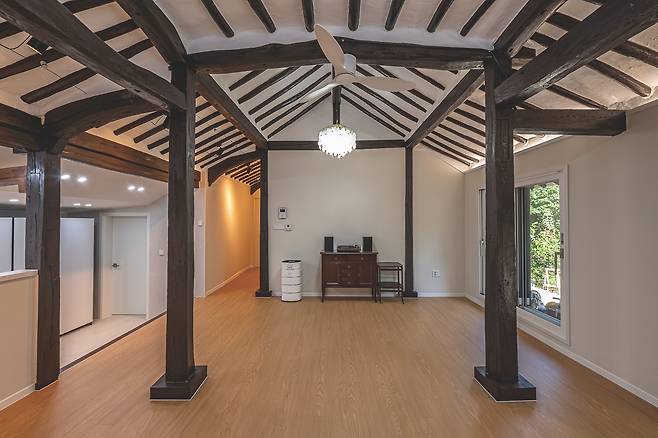 이번 프로젝트는 건축주의 요구를 충실히 반영하면서도 공간 본연의 성격을 더욱 뚜렷하게 정립한 사례다. 외부는 넓은 현무암 데크를 설치해 활용과 품격을 높였고 내부는 불필요한 장식을 배제해 군더더기 없이 연출했다. 포인트가 된 노출 서까래와 기둥은 구조미를 전한다. 건축주 역시 기존의 집을 완전히 허물지 않고 가장 아쉬운 부분을 보완해 완성해 가는 과정에 의미를 두고 만족을 느꼈다.