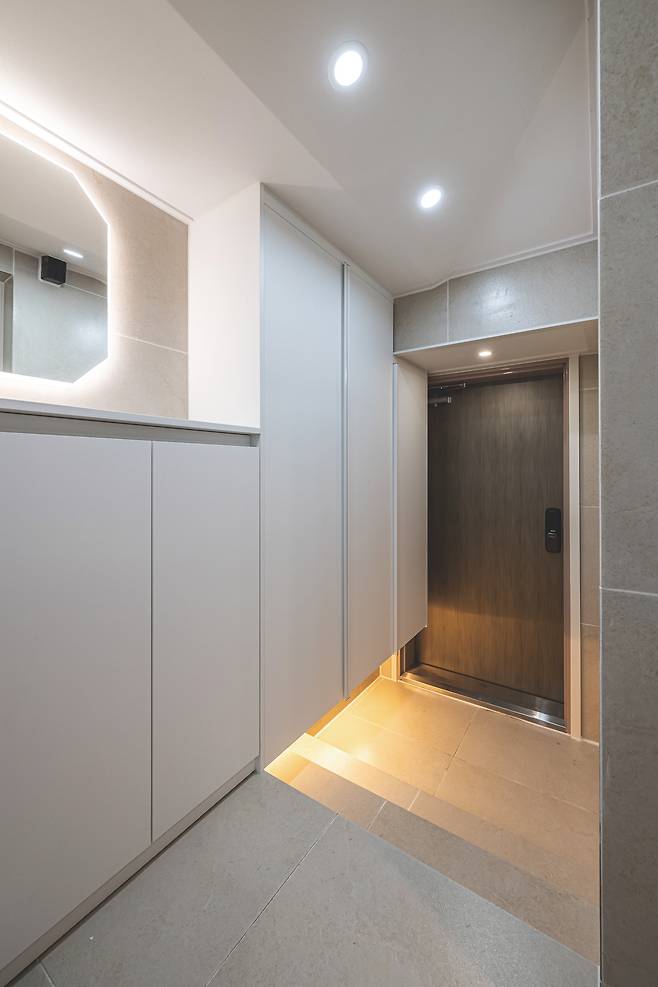 먼저 외부에 포치를 마련해 진출입할 때 비나 눈을 피할 수 있도록 계획했다. 기존 주택의 단차 문제는 약간 길게 설정한 현관 내에 계단을 계획함으로써 자연스럽게 해결했다. 현관을 들어서자마자 노출된 주방도 문제였다. 위치를 층고가 낮은 전면부로 이동시키고 중문을 지나면 복도와 거실이 먼저 맞이하도록 배치를 조정해 공간의 중심을 찾았다.