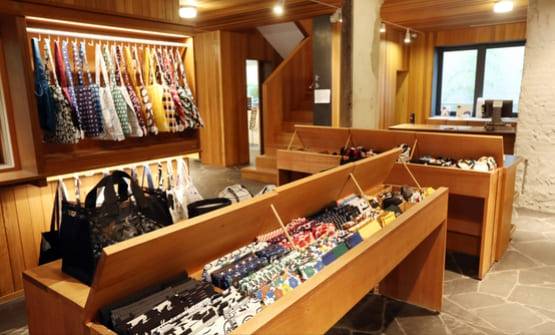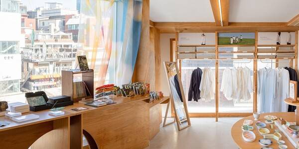 1층은 파우치, 가방 같은 소품류를 전시하는 곳으로, 한편에는 다른 브랜드와 협업한 작품을 선보이는 공간으로 구성되어 있습니다. 2층에는 침구류와 쿠션 등이 집처럼 아늑하게 전시되어 있어 마치 모델하우스를 보는 듯합니다.
