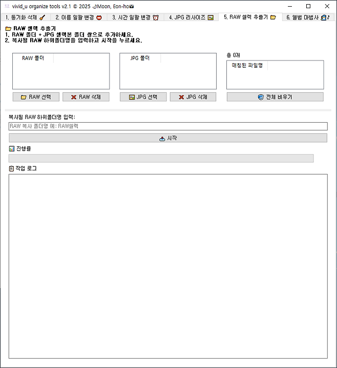 RAW 폴더와 JPG 폴더를 선택 하면 매칭된 파일명과 총 갯수를 확인 할 수 있습니다.