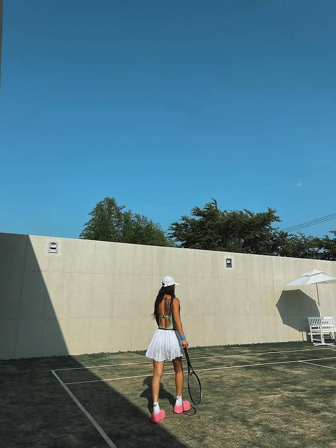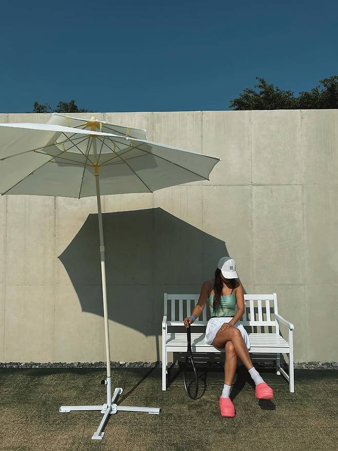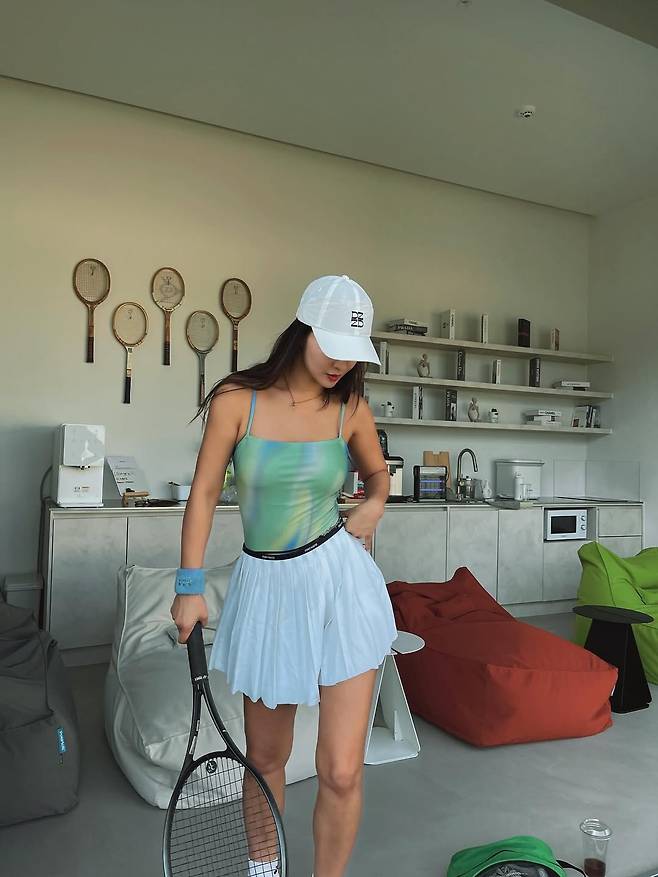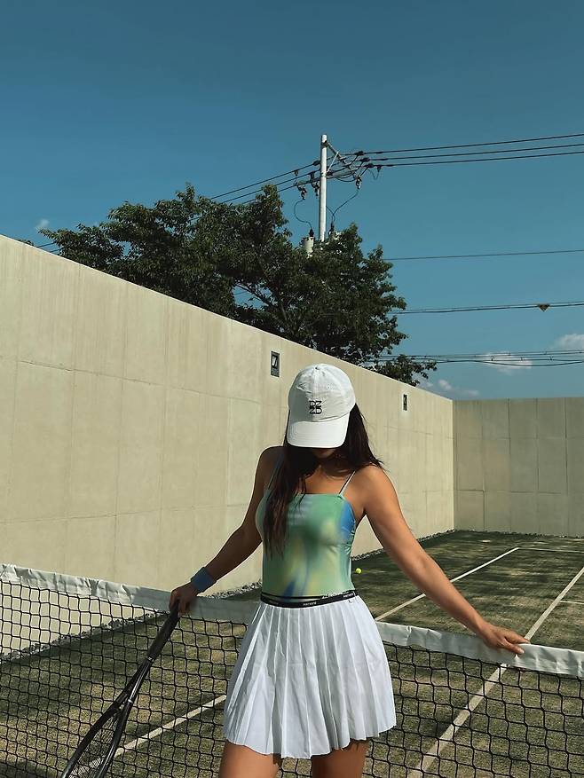 공개된 사진 속 황보는 화사한 그라데이션 슬리브리스와 플리츠 테니스 스커트, 그리고 화이트 볼캡과 손목 밴드까지 – 여름의 스포티 룩 정석을 완성했다.