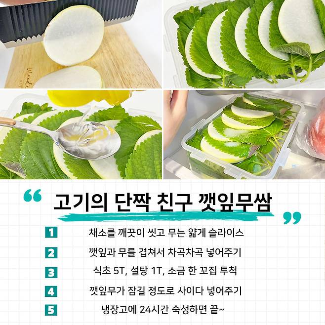 그런데 이번에는 다른 재료를 이용한 레시피가 다시 화제더라구요. 바로 얇게 썬 무와 깻잎을 이용하여 만드는 피클! 오이는 호불호가 있는 재료이지만, 요건 누구나 다 좋아하는 재료라서 많은 분들이 따라할 수 있을 것 같아요.