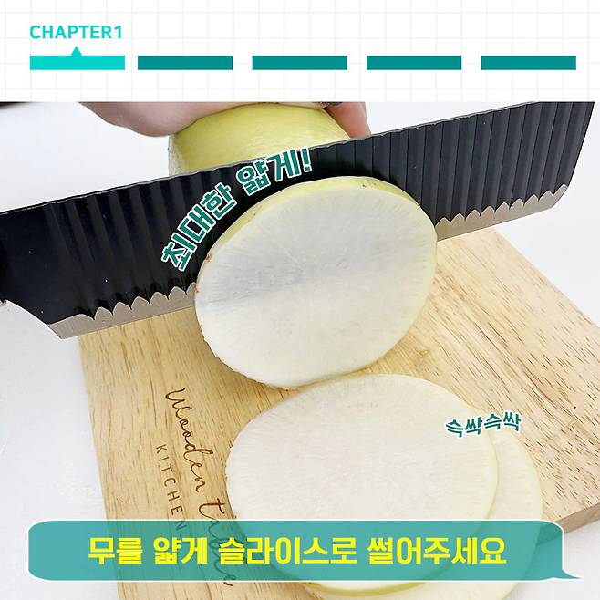 이제 무를 잘라 줄건데, 피클에 들어갈 무는 두꺼우면 안돼요! 국물이 잘 스밀 수 있도록 얇게 슬라이스 해주세요. 는 20장 정도 만들었어요. 브라더들은 각자의 취향대로 무를 썰어준 후 비율은 알맞게 조절하면 되겠죠?