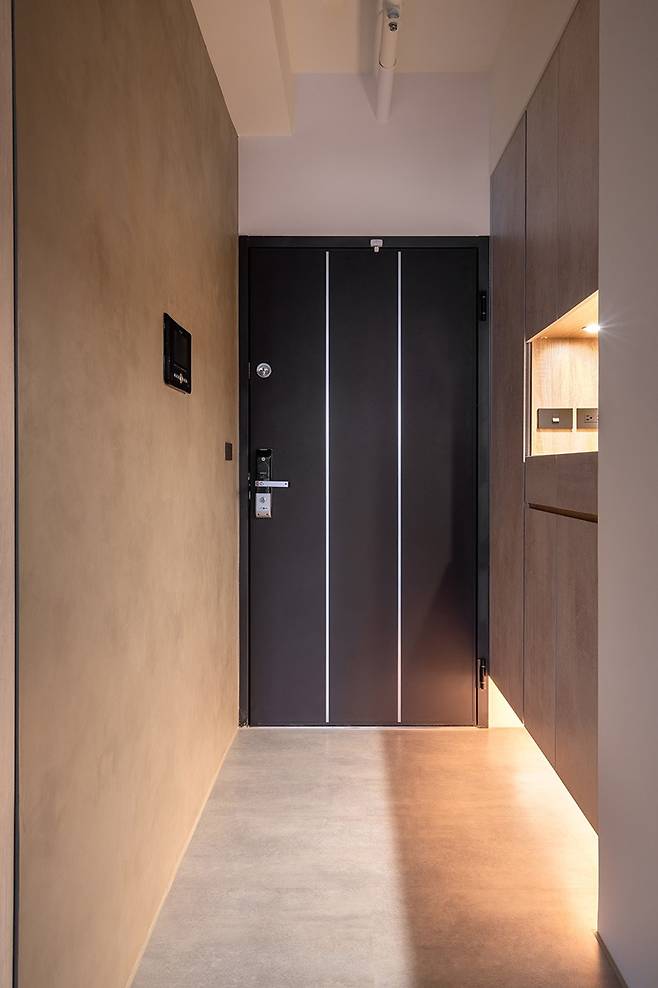 벽면 전체를 활용한 수납장은 신발과 잡동사니를 깔끔히 숨기고, 하단 조명은 아늑한 분위기를 더해줍니다.
