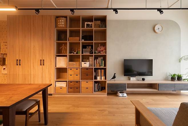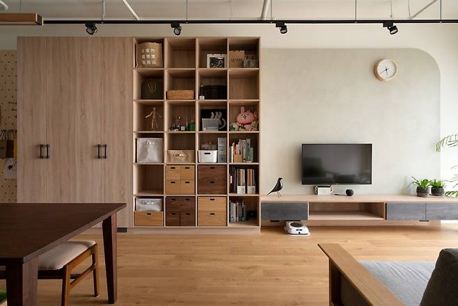 한쪽 벽면은 오픈형과 붙박이 수납을 함께 구성해 생활용품을 정리하기 좋고, 화이트,우드,블랙의 균형이 잡힌 조합이 깔끔한 무드를 완성합니다.