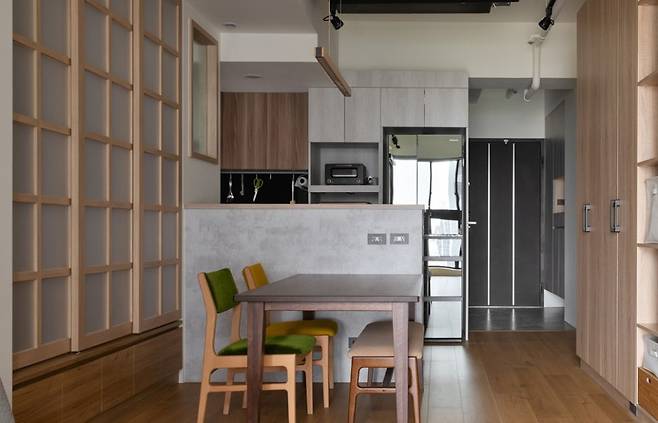 주방이 한눈에 드러나지 않으니 집이 훨씬 정돈돼 보이고, 조그만 식탁 하나만 있어도 따로 식사 공간처럼 느껴집니다.