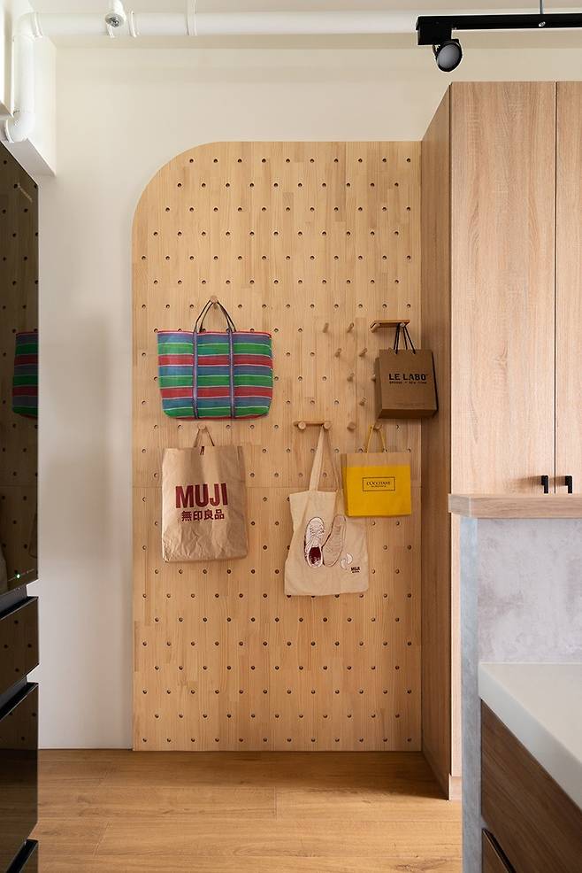 현관 옆 벽에는 곡선 모양을 살린 타공 우드판을 설치했어요. 가방이나 모자를 걸어두기 좋고, 실용적이면서도 일본식 미니멀 감성이 은근히 스며드는 디테일이죠.