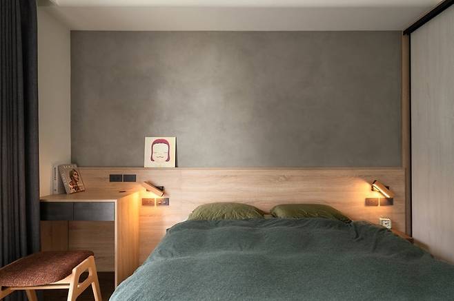 침대 헤드보드는 벽면과 일체형으로 제작해 군더더기를 줄였고, 매립 조명으로 은은한 빛을 더했어요.
