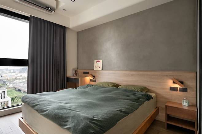 그레이 벽면과 우드 패널 조합이 차분하고 안정적인 분위기를 만들고, 짙은 그린 베딩과 차콜 커튼이 포인트가 됩니다.